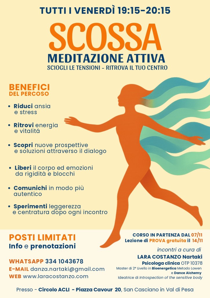 Integro esercizi di Bioenergetica (Training con Vittoria Talini- metodo Lowen formazione 2008/2010, Firenze); Dance Alchemy (Training con Maneesha McClure 1997 Arezzo/2024 Siena); DanzaTerapia metodo Fux 2001 Firenze; Meditazioni Attive di Osho (Formazione con Manish Simon 1995/2021), e Training Autogeno (formazione presso M.O.P.I. Firenze 2001).